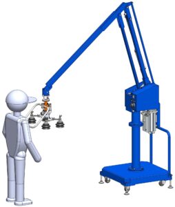 本機は、背丈の低いエア式バラマン(BMG型)に、段ボール箱用のバキューム式アタッチメントを装備した助力装置です。本体高さが低い(約2700mm)ので、導入現場の天井が低いところでも使用可能。また、台座はキャスタ付で手押しによる移動ができるため、レイアウト変更が容易です。
